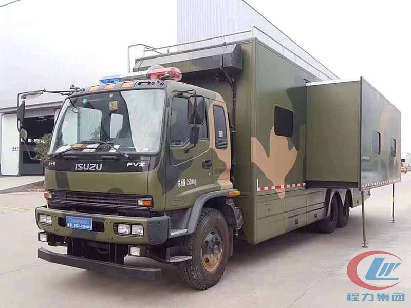 后勤保障车主要包括后勤保障炊事车、厕所车、净水车、被服洗涤车、淋浴车、后勤保障宿营车等车型;宿营车主要用于烹饪食品、餐饮加工,整车一般配备有发电机、冰柜、冷饮机、售货台、炊具、消毒柜等设备;后勤保障宿营车主要由宿营方舱、宿营设施,空气调节系统、淋浴系统、水路系统、电气系统等组成,能够满足16-36 人的住宿;程力后勤保障车系列炊事车、淋浴车、厕所车、宿营车整车改装设计符合国家对汽车设计改装的相关要求,在保证运载工具行驶安全的前提下,能满足车载设备安装、运行和人员工作、生活需要;整车机动灵活、可靠性高、环境适应性好,性价比高;
