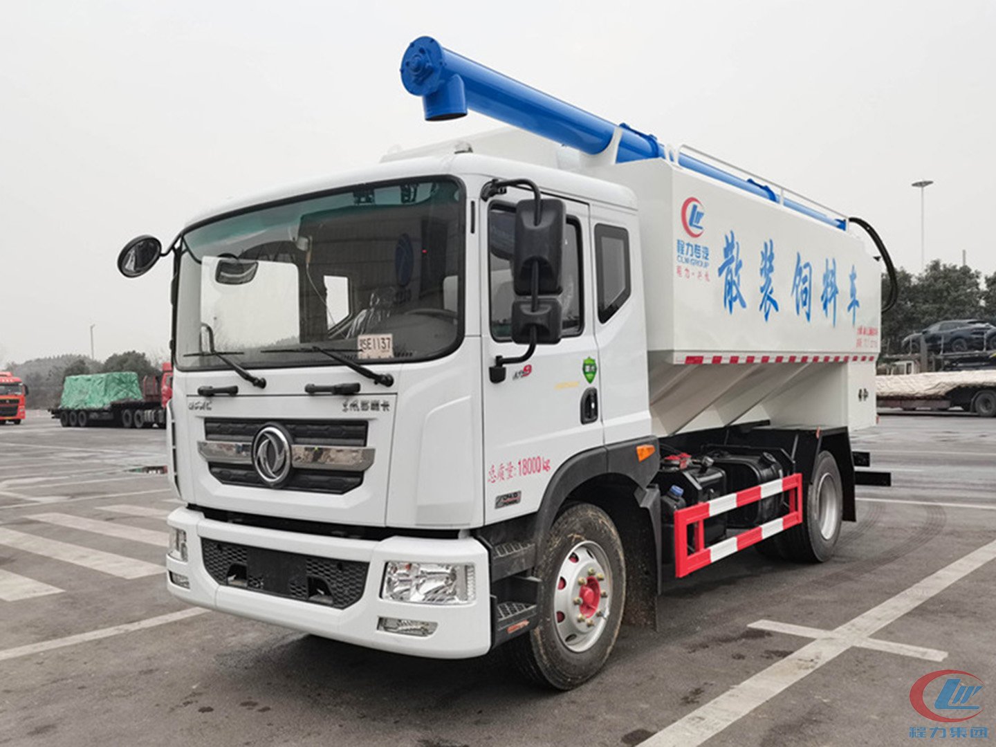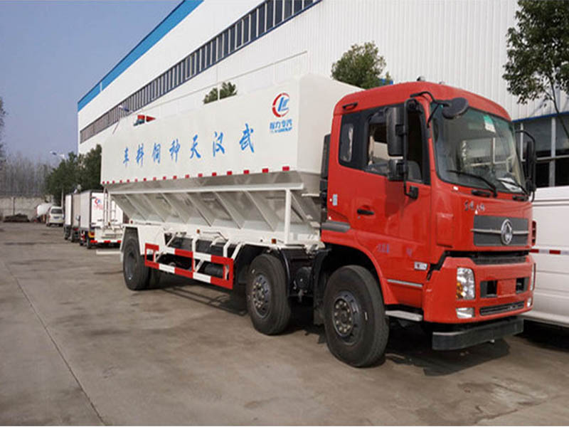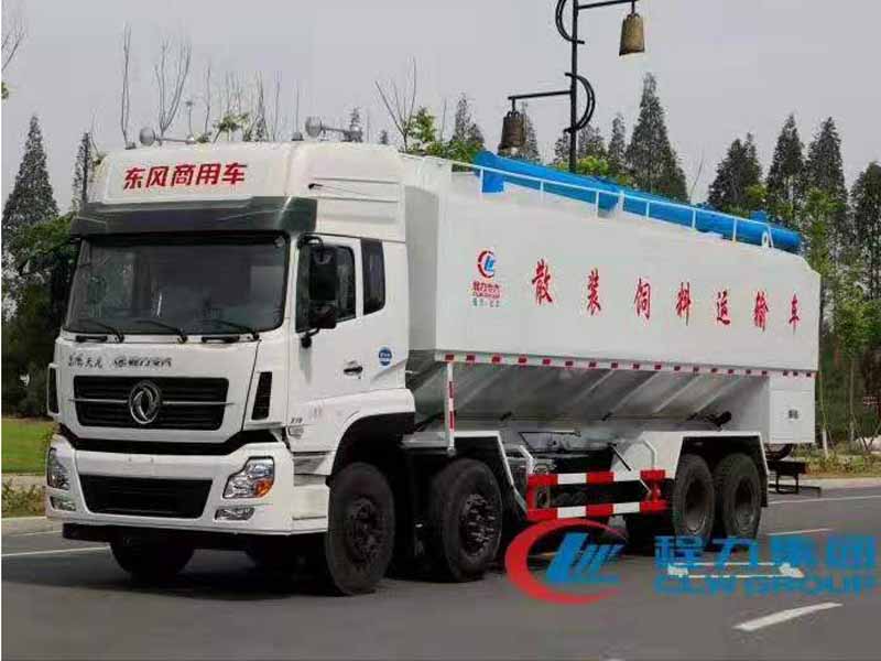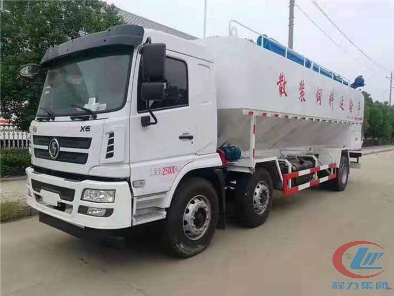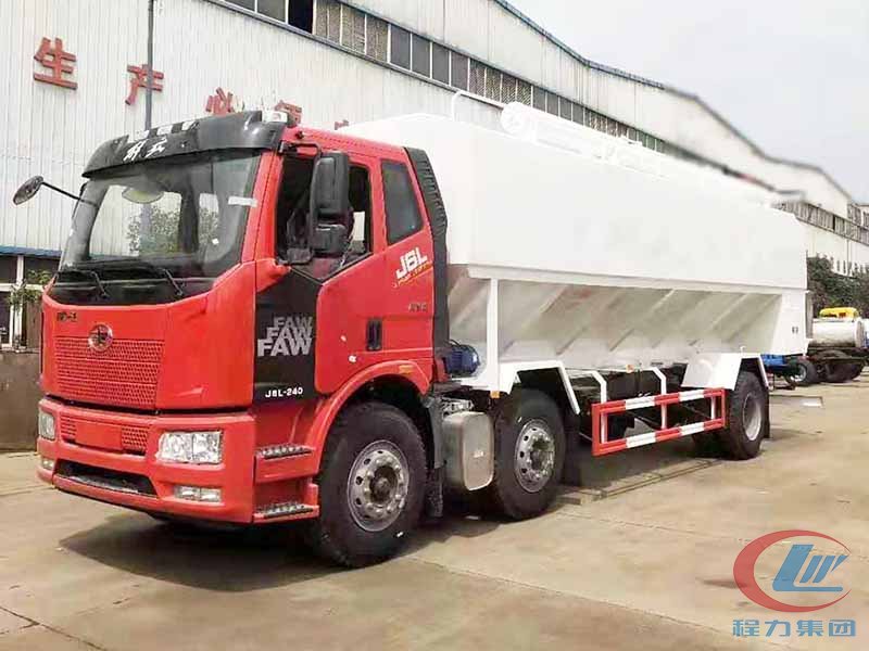 散装饲料车(英文:bulk feed truck)是用于运输散装饲料的专用车,主要用于饲料厂将生产出来的饲料运输到养鸡场、养猪场等;散装饲料车同时也可用来运输某些无腐蚀性粉粒状原料,如制药厂粉料和粮库周转。散装饲料车的饲料罐架设在卡车的底盘上,罐体根据饲料种类不同可以结合用户需求进行分仓,罐顶开有进料口,顶部设有一根螺旋输送卸料管(俗称卸料绞龙,绞龙根据其动力不同可以分为电动绞龙或者液压绞龙)则可自由旋转和抬升。程力散装饲料运输车打造行业精品,以优良的性能和经久耐用赢得市场,成为国内多家知名畜牧公司首选品牌。程力饲料车热销车型:东风多利卡饲料车、东风天锦小三轴饲料车、柳汽乘龙饲料车、东风天龙饲料车半挂饲料车等等。