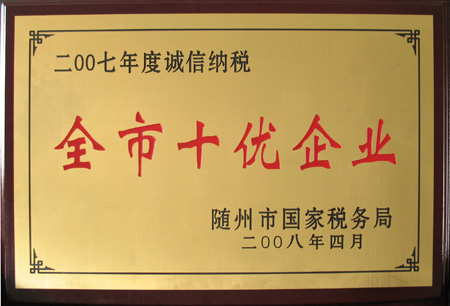 2008年4月24日星期四上午9点,在随州市国家税务局大会议室举行的“2007年度全市诚信纳税企业表彰会议”上,湖北程力专用汽车有限公司被湖北省随州市国家税务局评为“2007年度诚信纳税‘十优企业’”。湖北程力专用汽车有限公司总经理程阿罗代表程力汽车参加了表彰大会,并接受了奖牌。