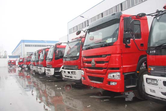 下图是柬埔寨公安部来程力检查验收115台庆铃五十铃泡沫消防车和发车场景图: